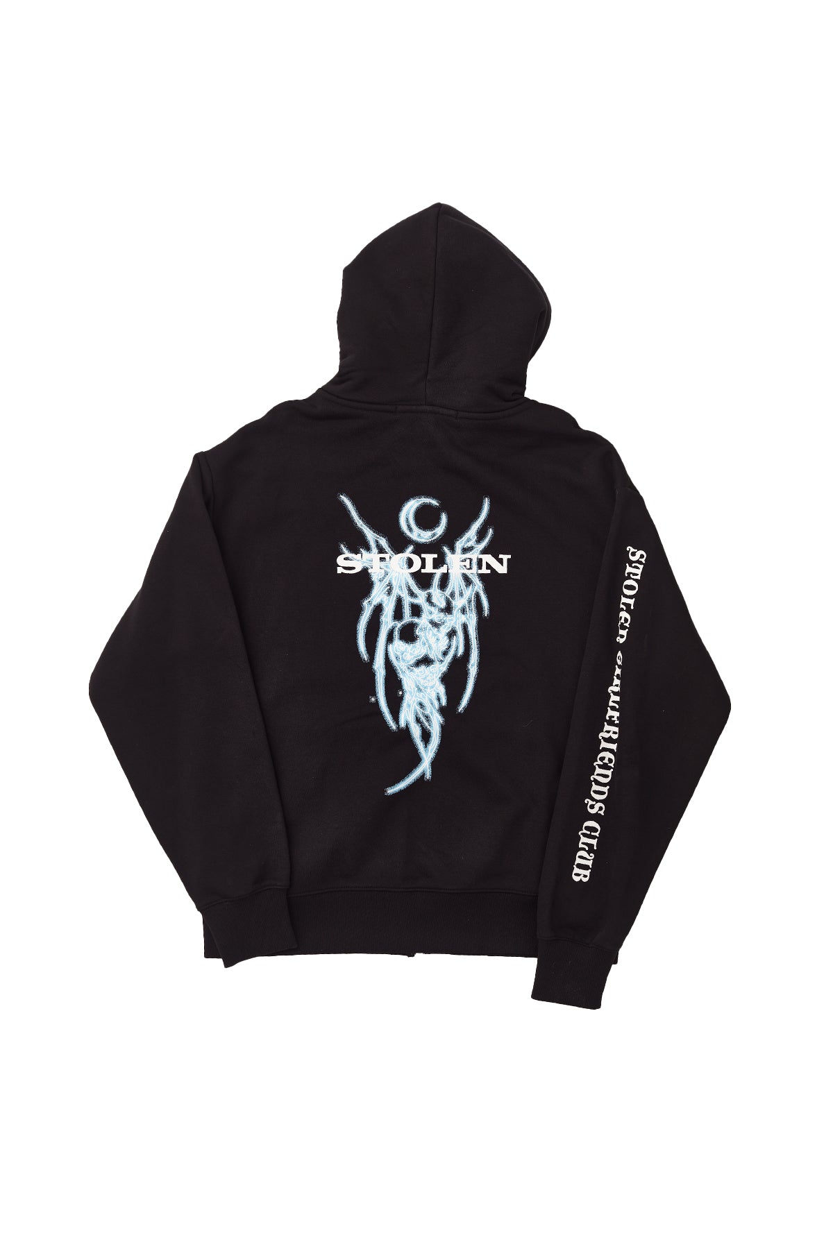 The Celestial zip through hood is made from a weighty brushed cotton fleece with front and back print.
