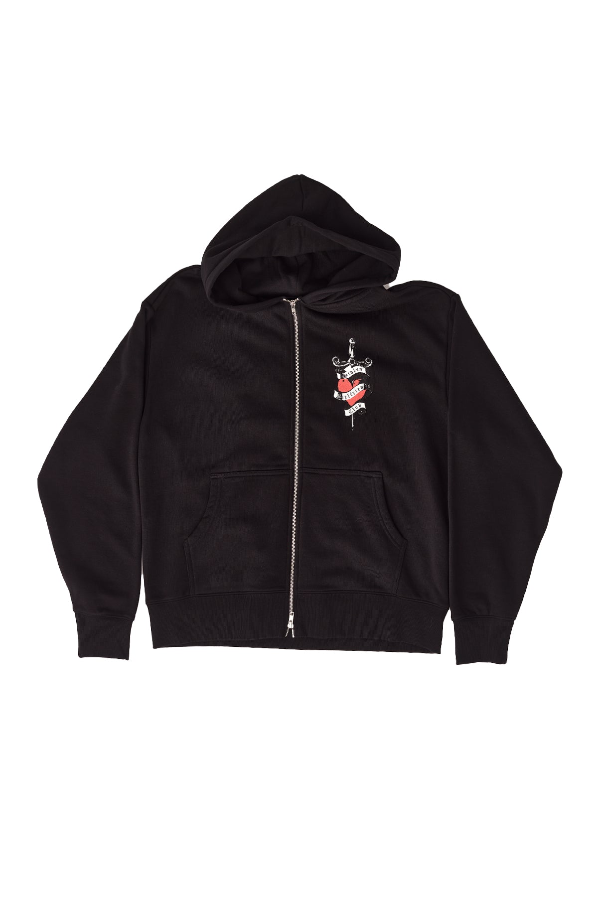 The Heart Dagger zip through hood is made from a weighty brushed cotton fleece with front and back print.