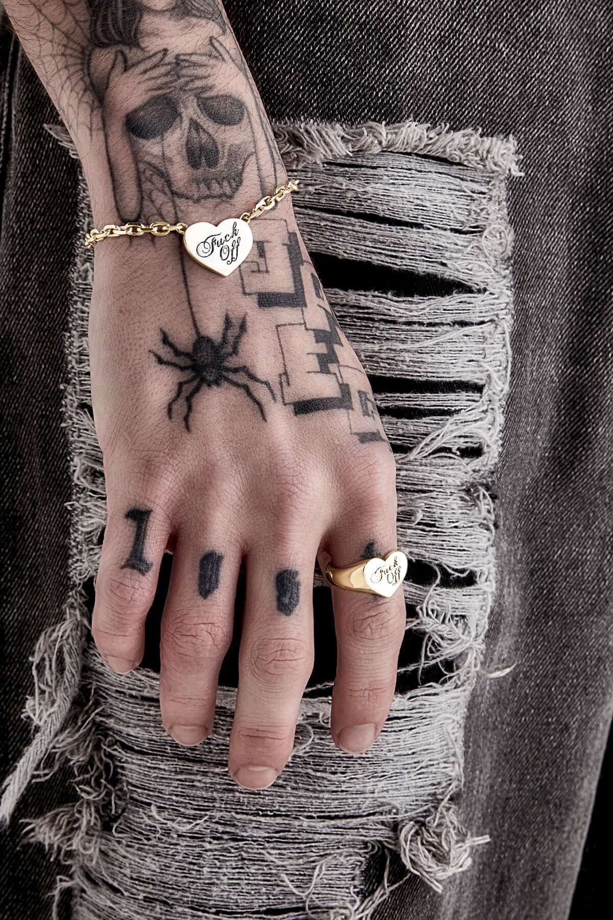 Gold Heart Ring with 'Fuck Off' Script Text on White Background - Stolen Girlfriends Club Warm Welcome Heart Ring
