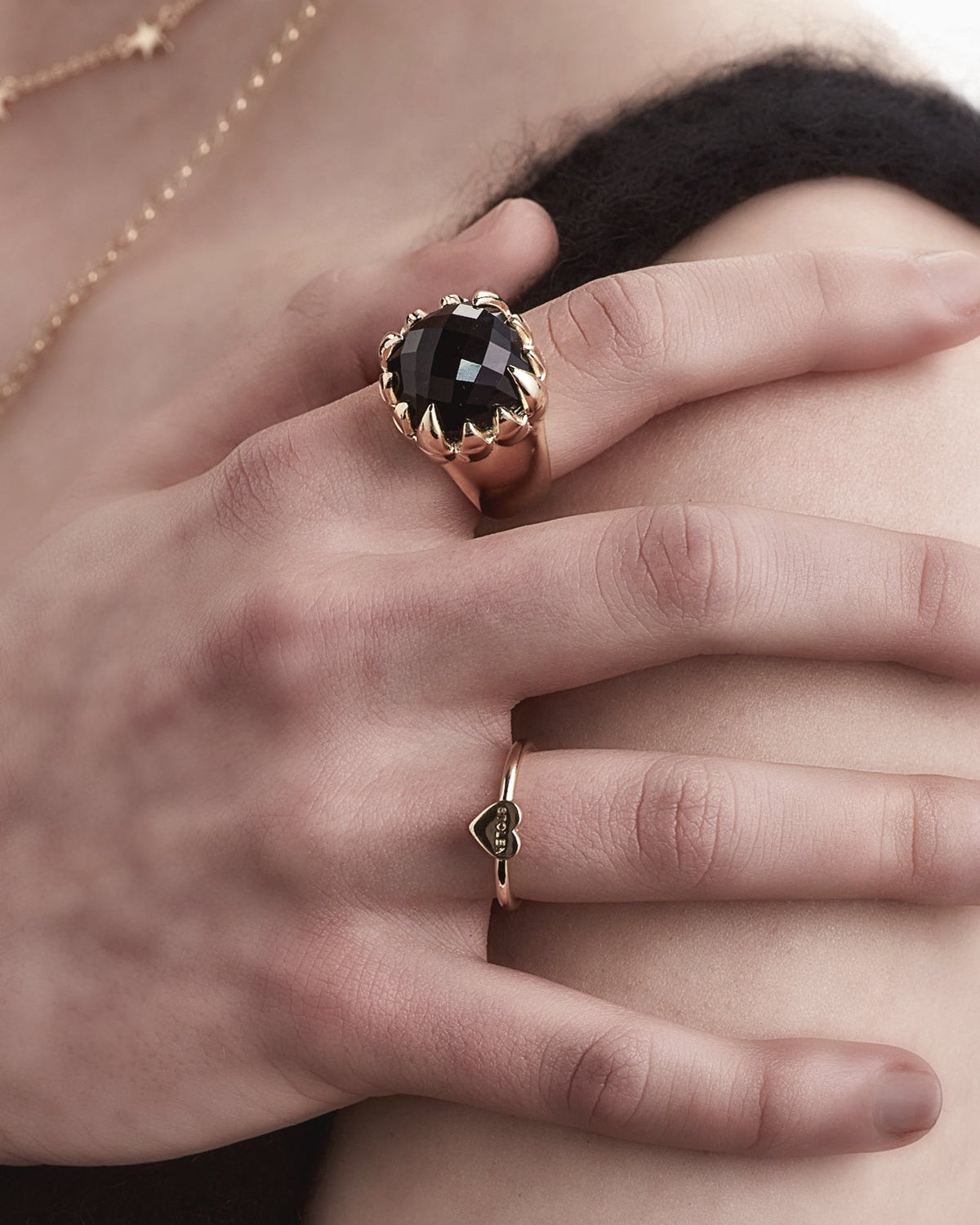 With its 18k gold-plated glow, this slender sterling silver ring is anchored by a softly sculpted heart, engraved with our signature hallmark logo. Minimal yet expressive, it offers quiet presence—whether worn alone or in considered layers.
