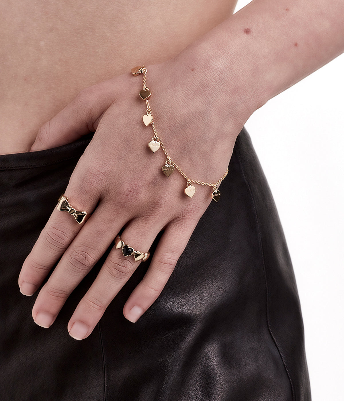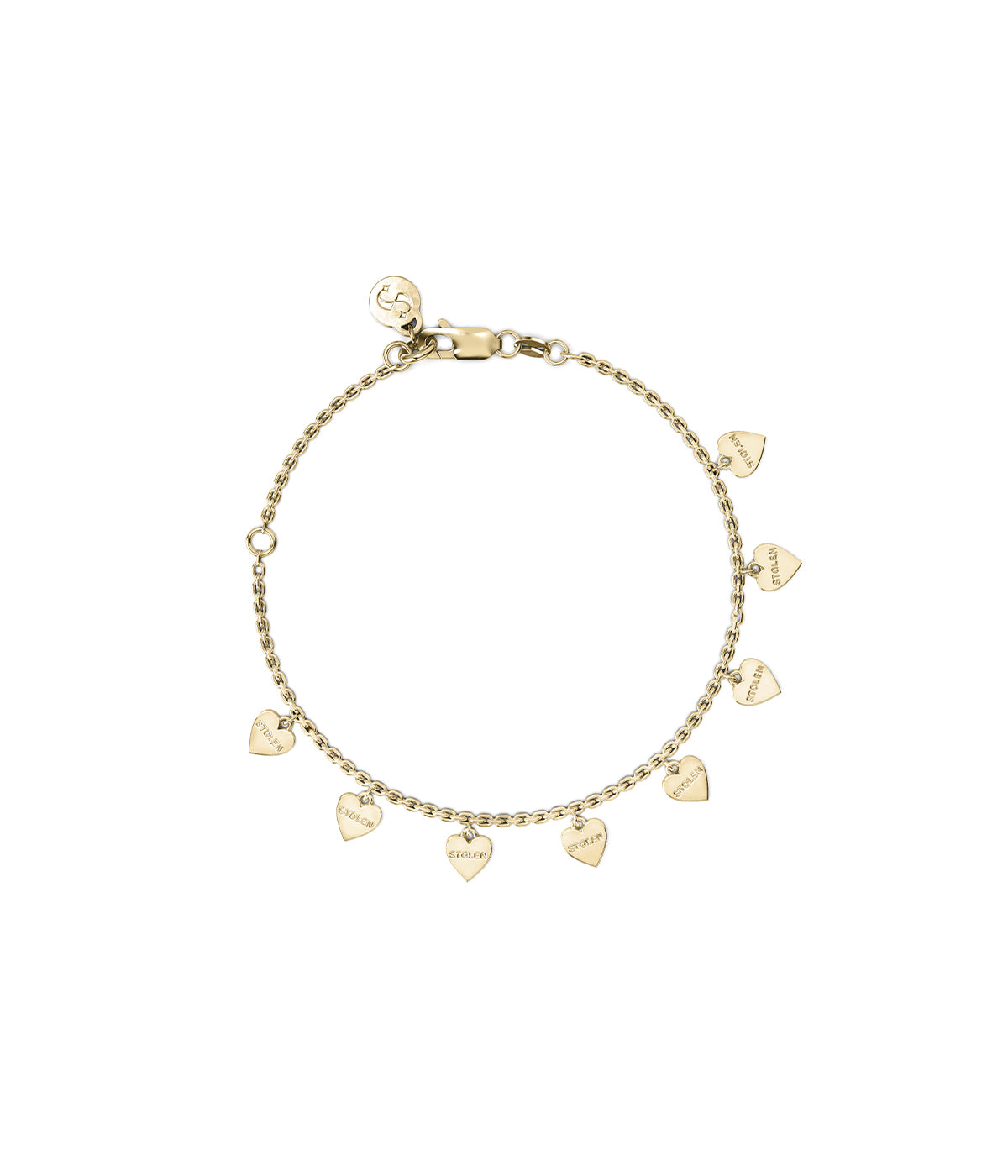 Crafted in 18k gold-plated sterling silver, the Stolen Heart Bracelet features a fine chain dotted with polished heart charms, each engraved with STOLEN. Lightweight and fluid, it offers a playful take on sentimentality while remaining sculptural and refined.