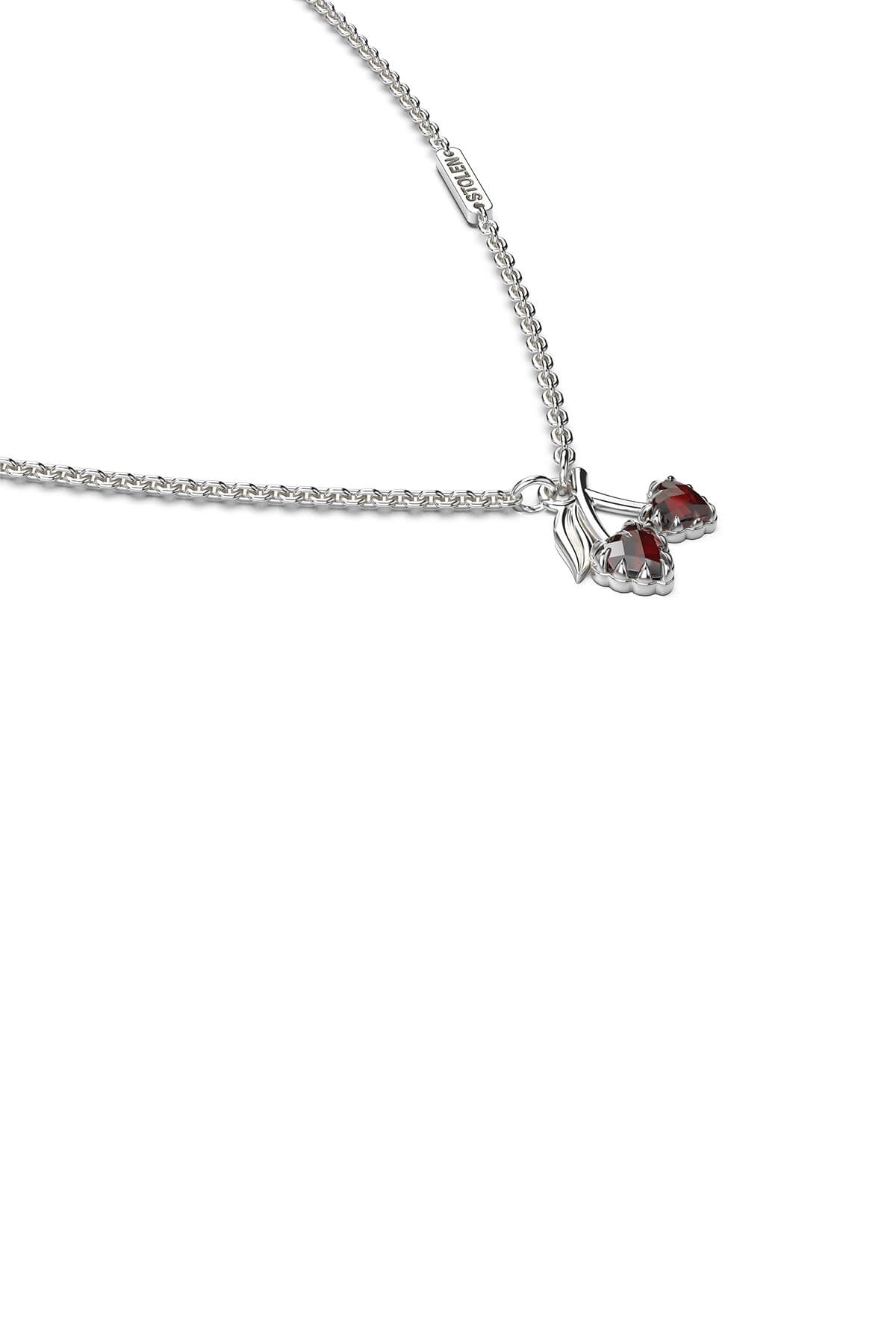 This limited-edition collection distills the duality of sweetness and strength. The Love Cherry Necklace blends our signature Love Claw motif with a playful twist. A rich garnet heart, claw-set as a cherry, sits on a sterling silver chain—half smooth beads, half elongated links. Made from solid sterling silver.