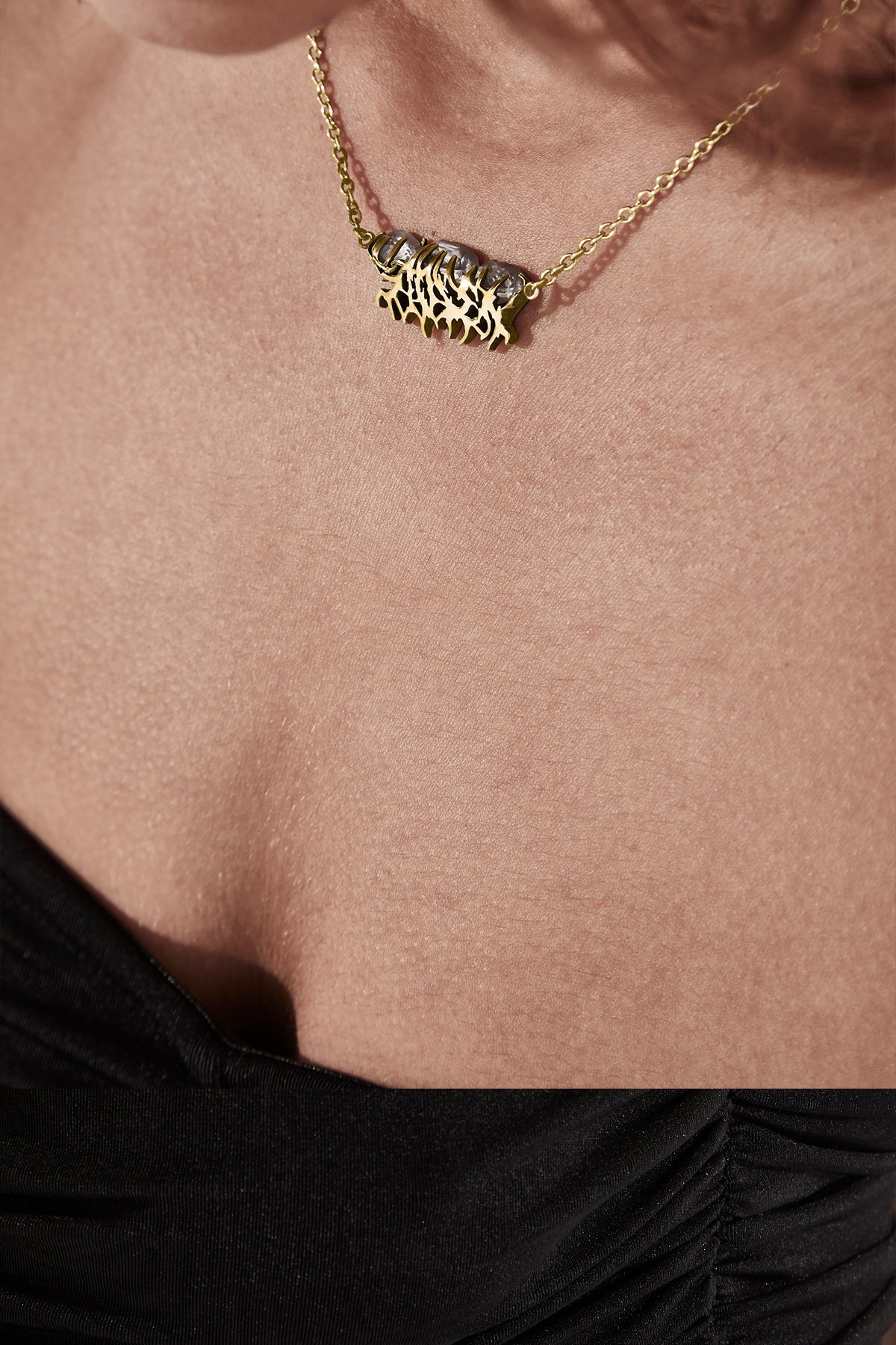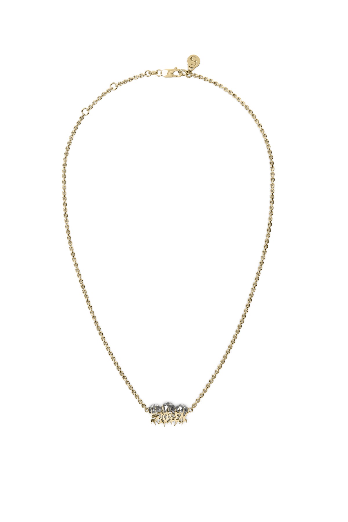 At first glance, it feels ornamental — three stones in traditional claw settings strung across a fine chain. But the details shift expectation. Each clear quartz is oversized, hyper-faceted, and framed in talon-like prongs that read more sculptural than delicate.