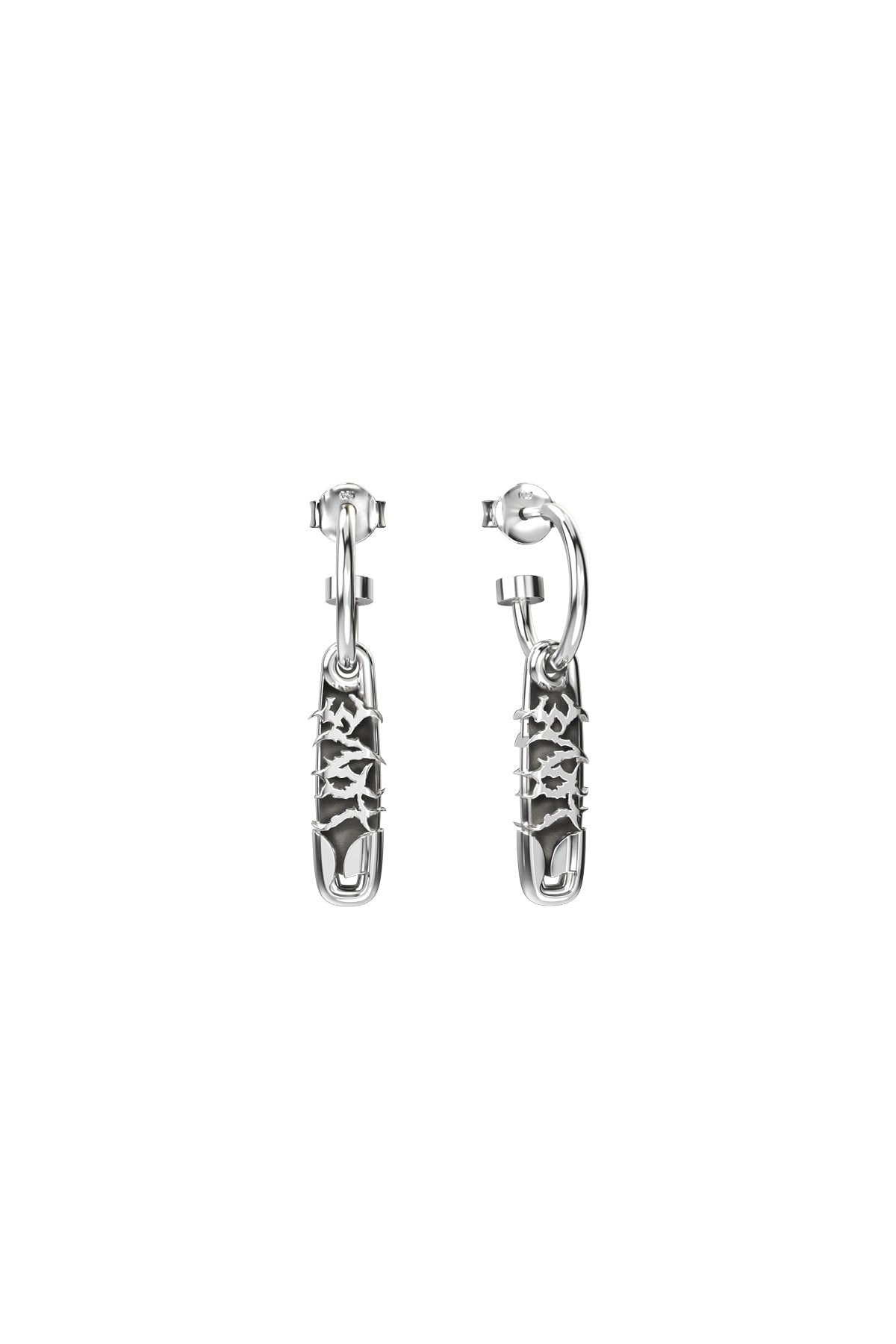 The Love and Chaos earrings features safety pin charms cast in solid sterling silver, dangling from our signature anchor hoops. Centred with gothic “LOVE” and “CHAOS” inscriptions in death metal typography, it draws from antique fobs and industrial closures.