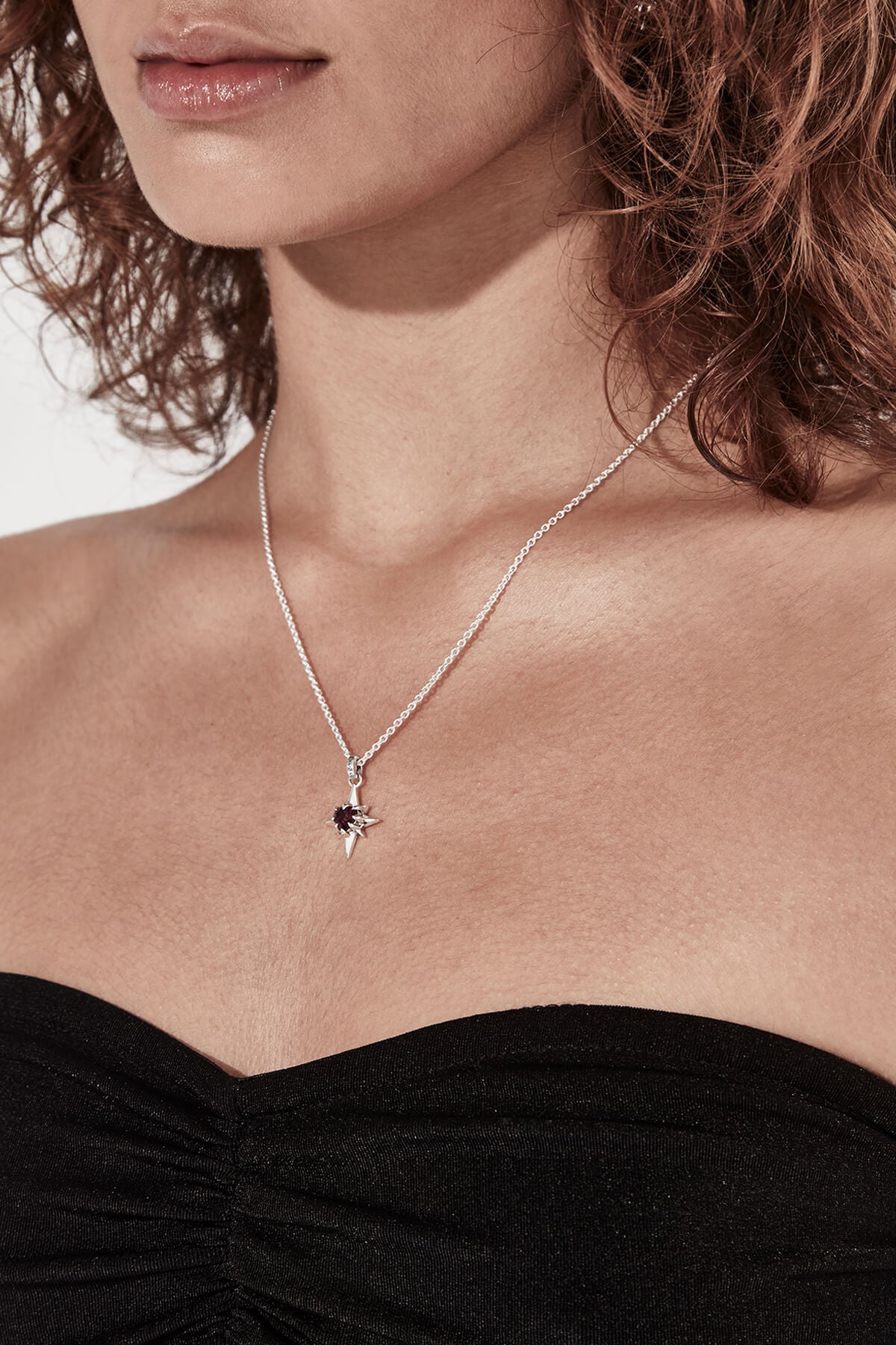 Gothic Star Necklace on Model- Sterling Silver & Rhodolite stone - Stolen Girlfriends Club