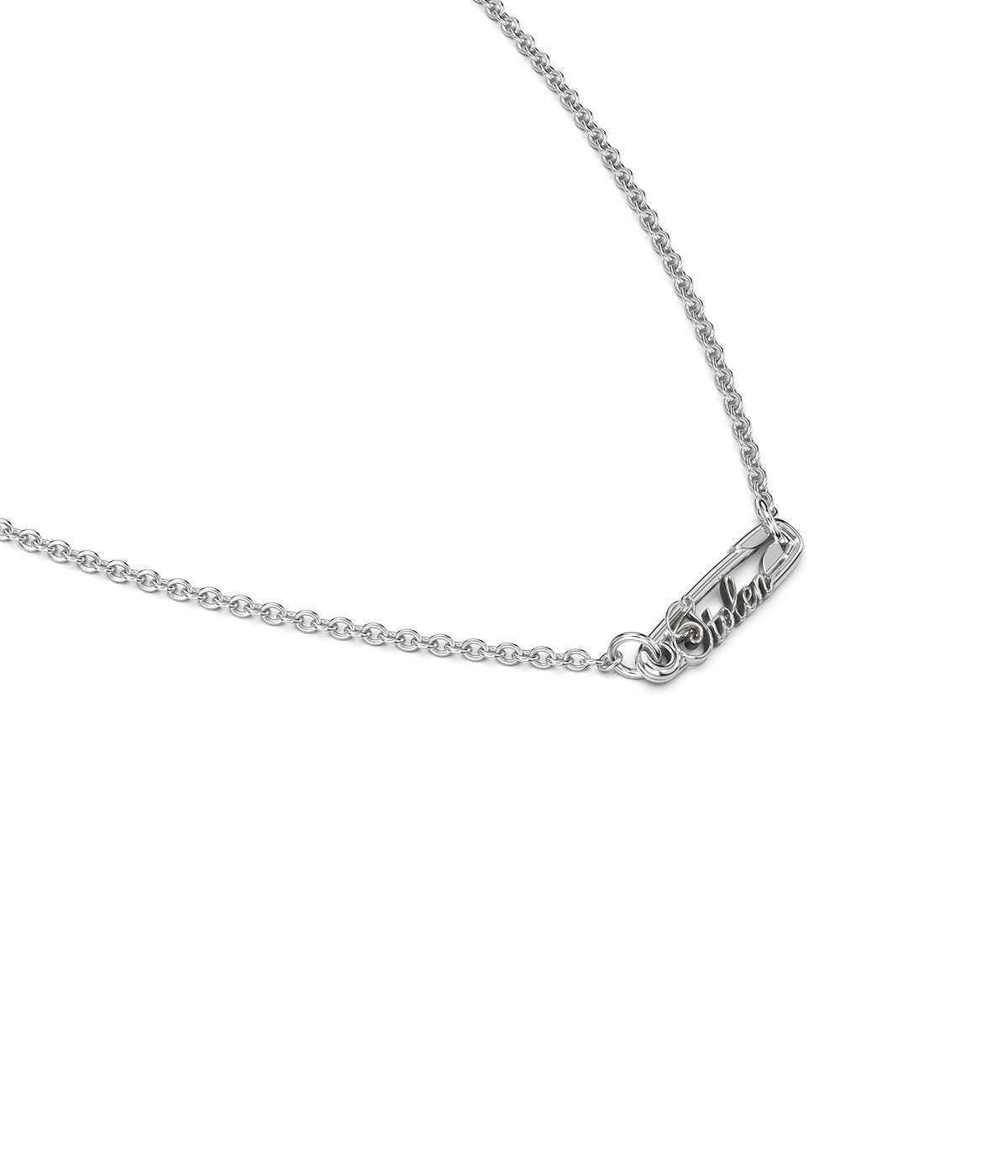 This limited-run piece blends subversive minimalism with sentimentality. Designed for self-expression or the perfect gift of love, the Scripted Pin Necklace features a stylised safety pin engraved with “Stolen” in signature script. Cast in solid sterling silver and suspended on a fine belcher chain.