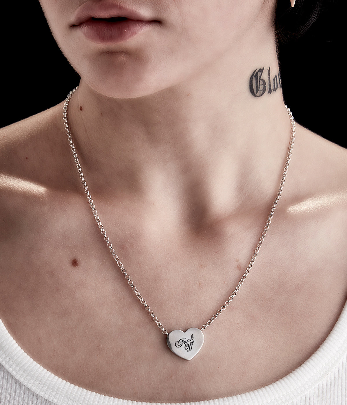 Our sell-out statement necklace features a timeless heart-shaped pendant with beautiful script 'Fuck Off' engraving given an oxidised effect, and set upon an adjustable 43.5cm cable chain. The Warm Welcome Heart Necklace is made from solid sterling silver with a high polish finish.