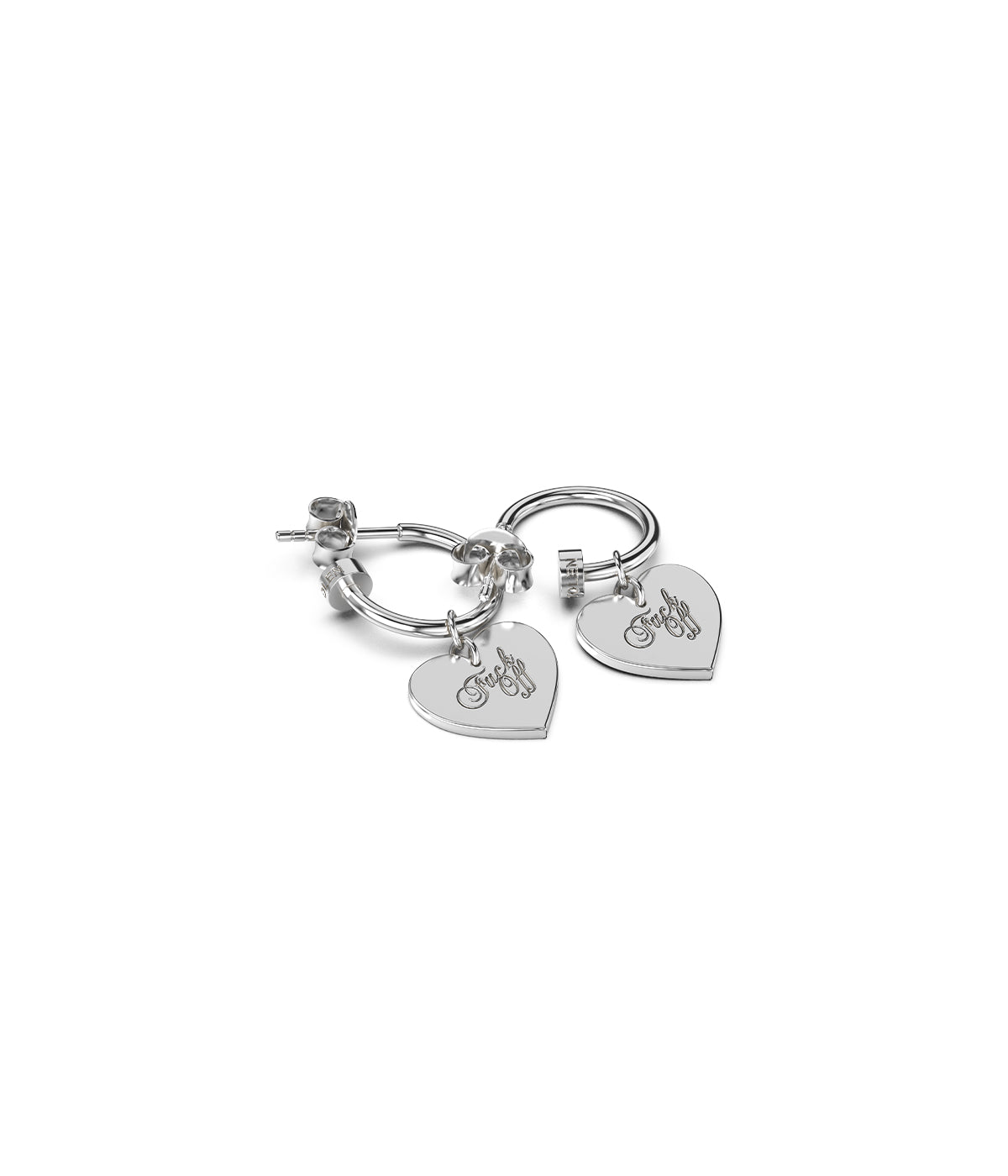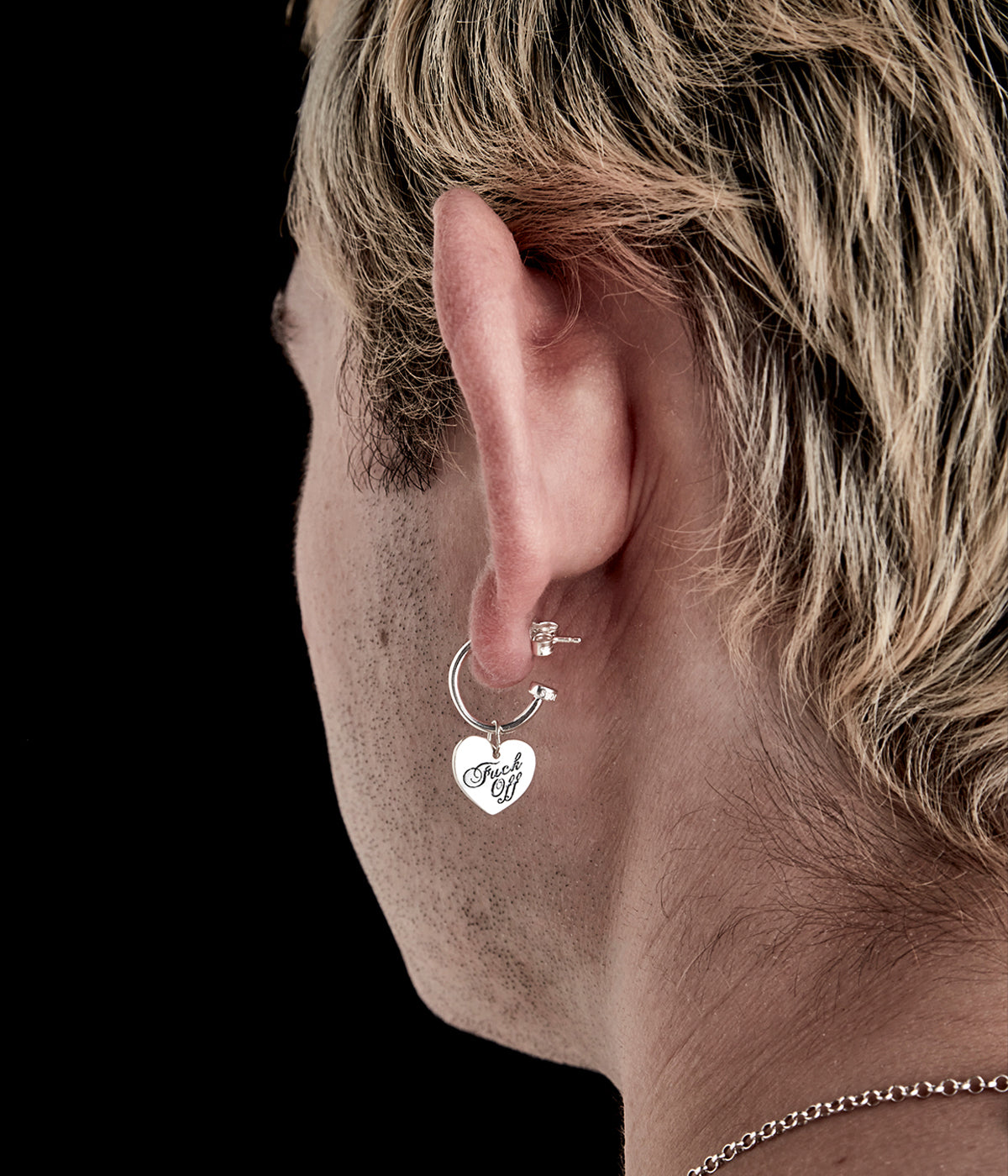Our Warm Welcome Heart statement sleepers feature heart-shaped charms with beautiful script 'Fuck Off' engraving, oxidised for a bold effect and secured with a butterfly closure. This pair of luxury hooped-style sleepers are made from solid sterling silver with a high polish finish.