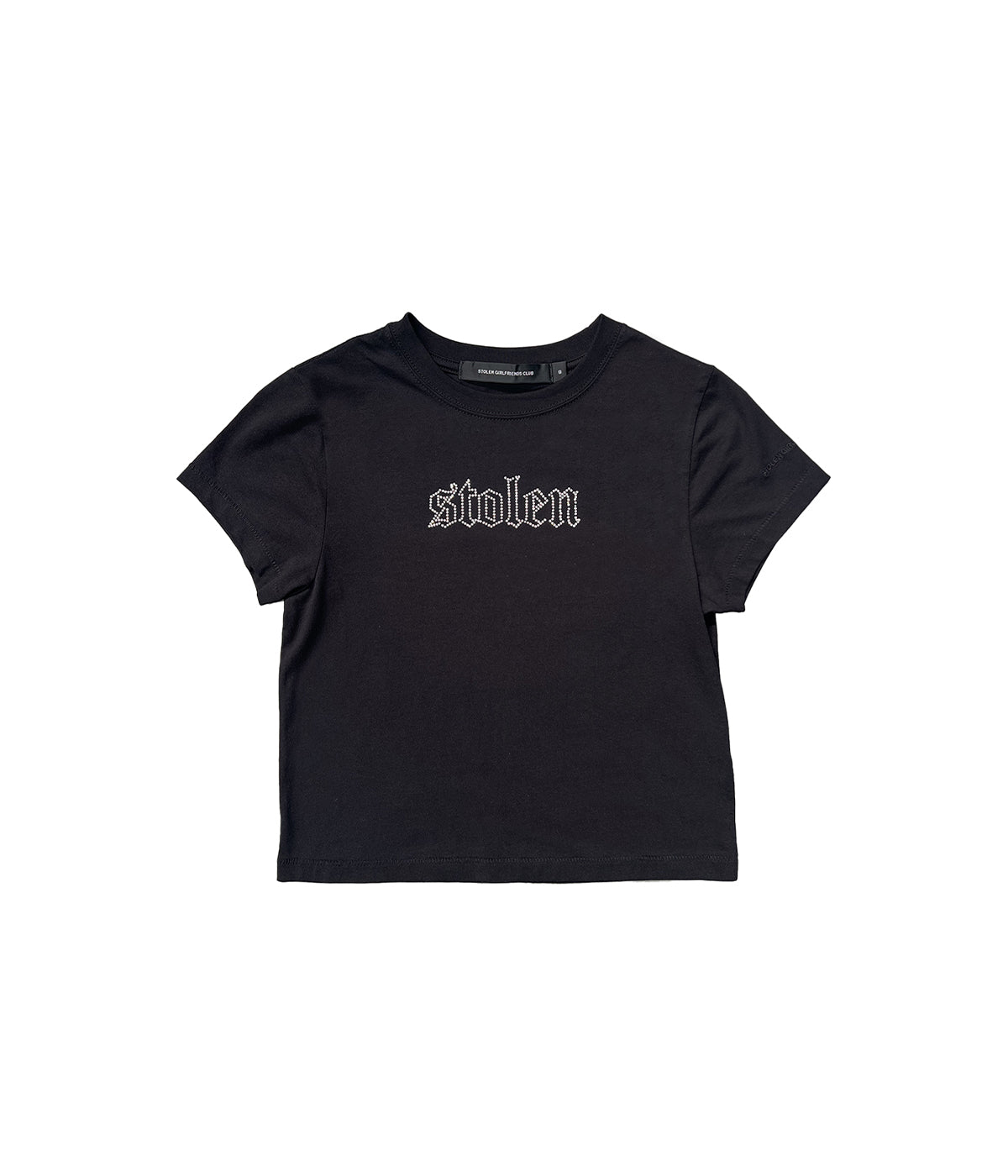 Our all-new baby-fit t-shirt is cut for a fitted silhouette from a soft cotton jersey. With cropped hem and sleeves, the Gothic Baby t-shirt is adorned with our iconic STOLEN logo arranged in Old English script from shimmery gems.