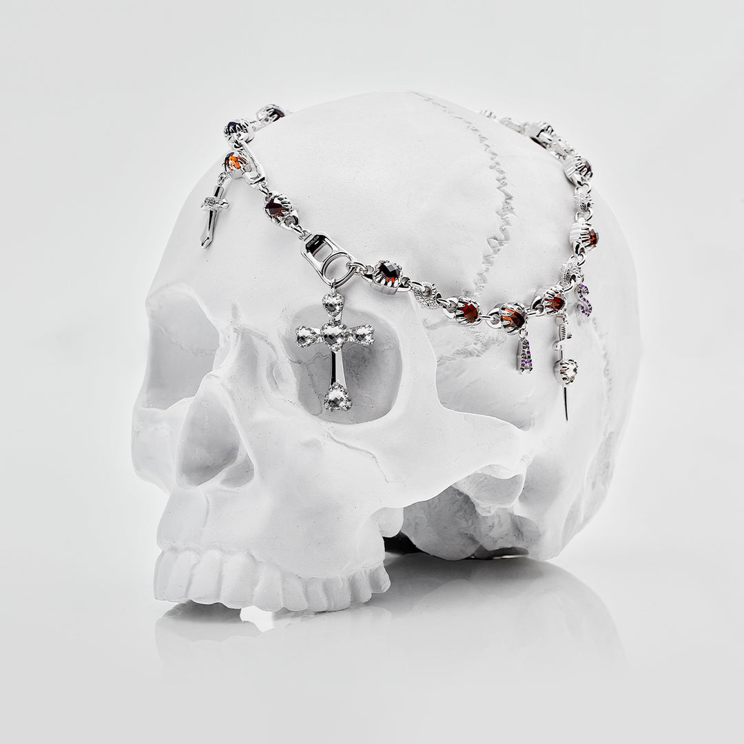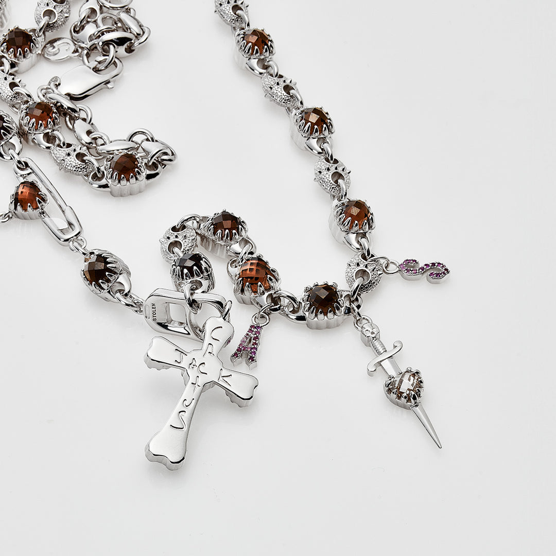 THE NECKLACE IS FURTHER PUNCTUATED BY A COLLECTION OF MISMATCHED CHARMS, WITH SUBTLE HINTS OF PUNK ICONOGRAPHY REFLECTING TRAVIS’S UNAPOLOGETIC NATURE.