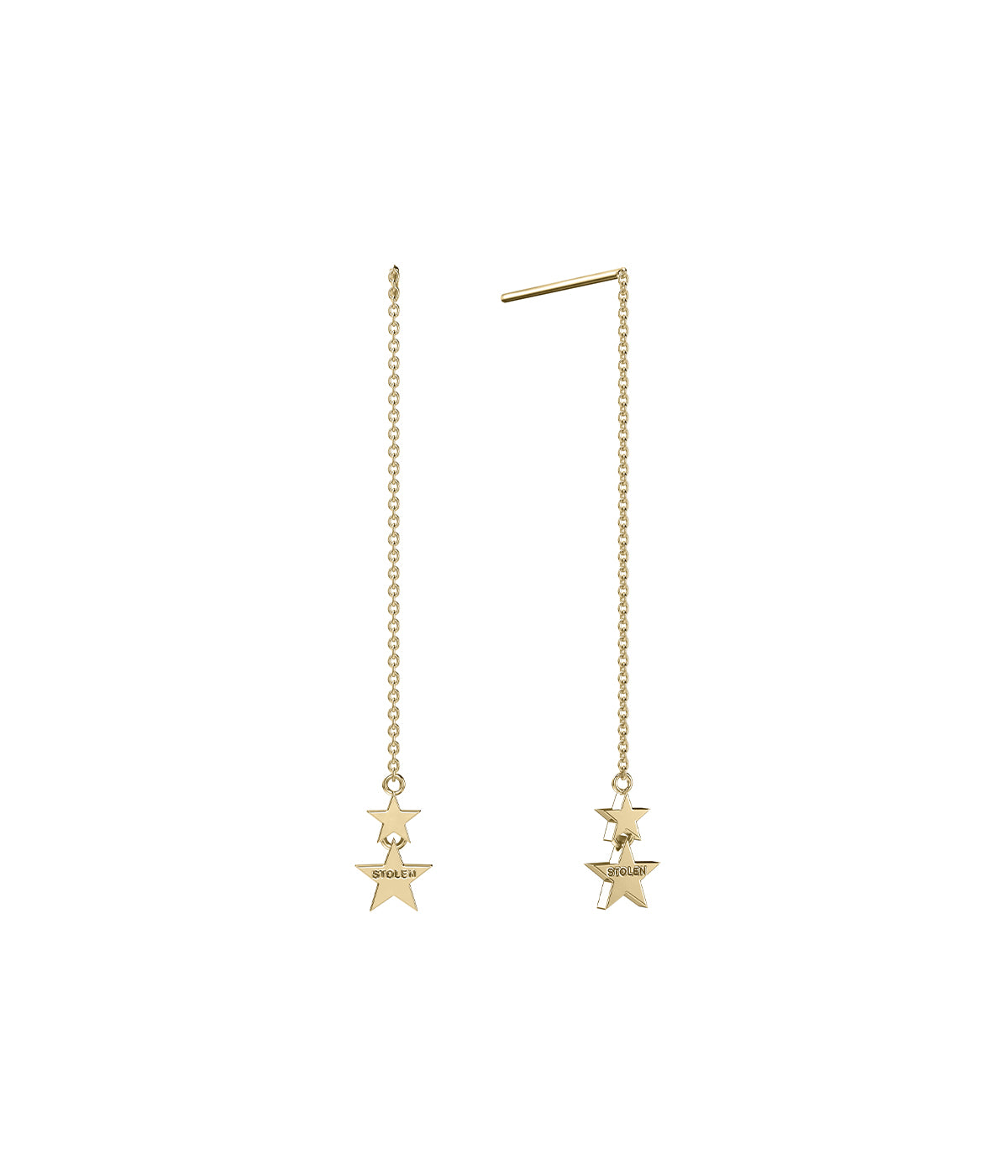 Our Falling Stolen Star Earrings are made from a sterling silver base and coated in 1.5 microns of 18k yellow gold. This pair of thread-style earrings feature our delicate, mini star charms set on an ultra-fine chain.