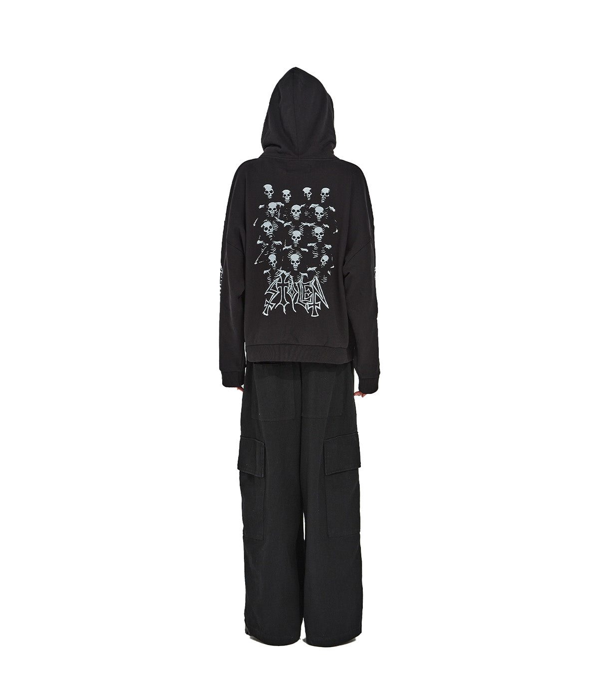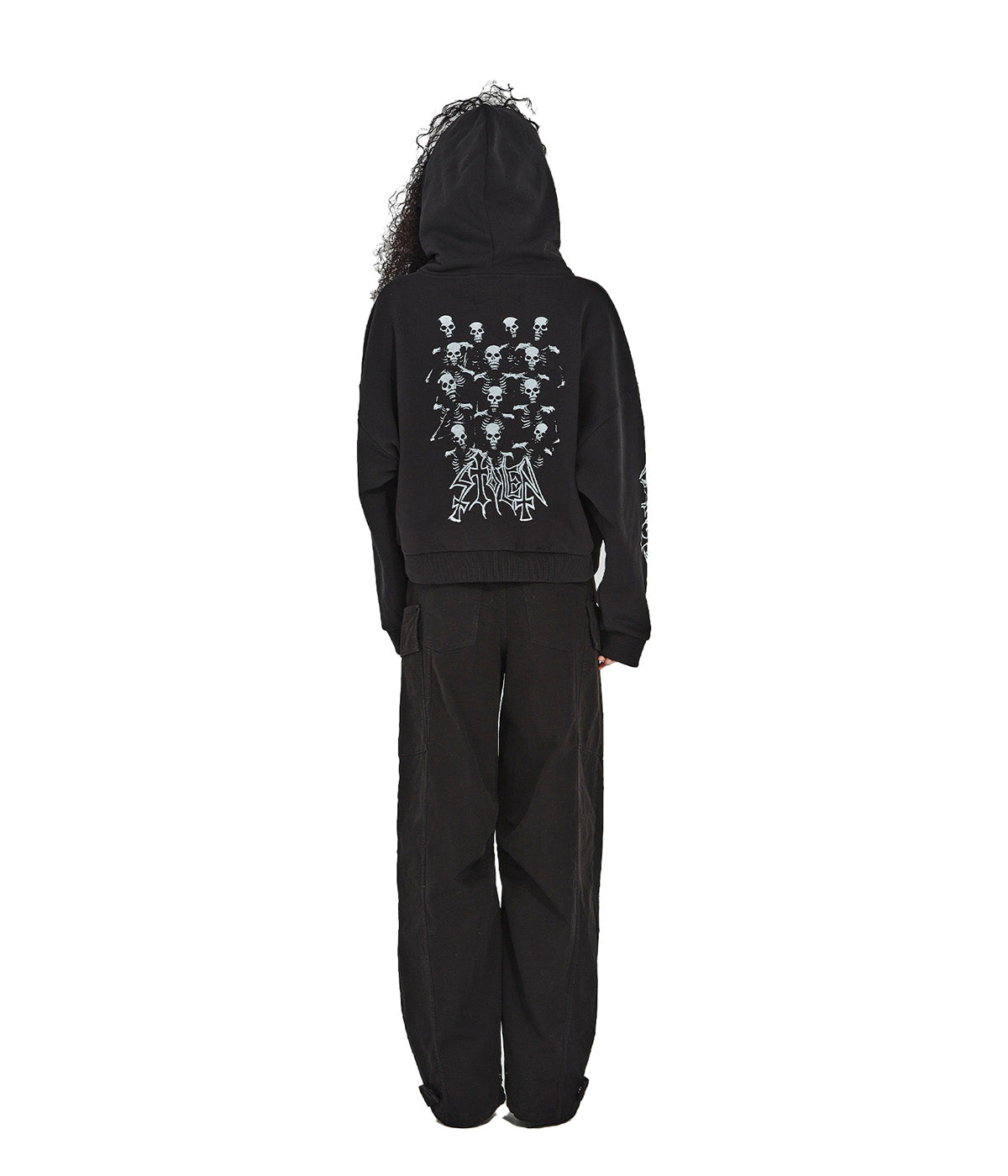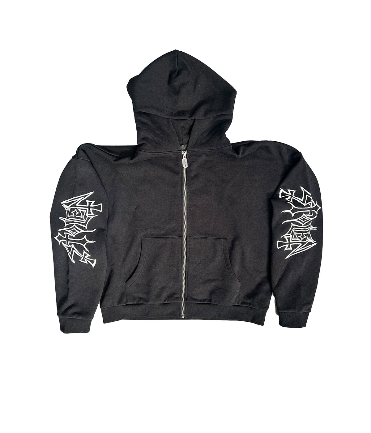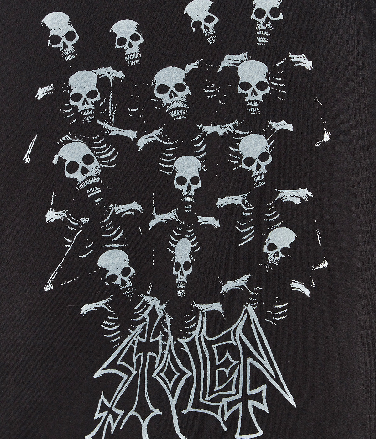 Our cult-favourite zip-up returns - reimagined with fresh hand-drawn artwork by our creative director. The Lucky 13 Hood is crafted from heavy brushed organic cotton fleece, featuring hand-sketched logos down the sleeves and a striking skeleton back print. Cut for a cropped and boxy silhouette with drop shoulders and finished with our signature razor blade zip.