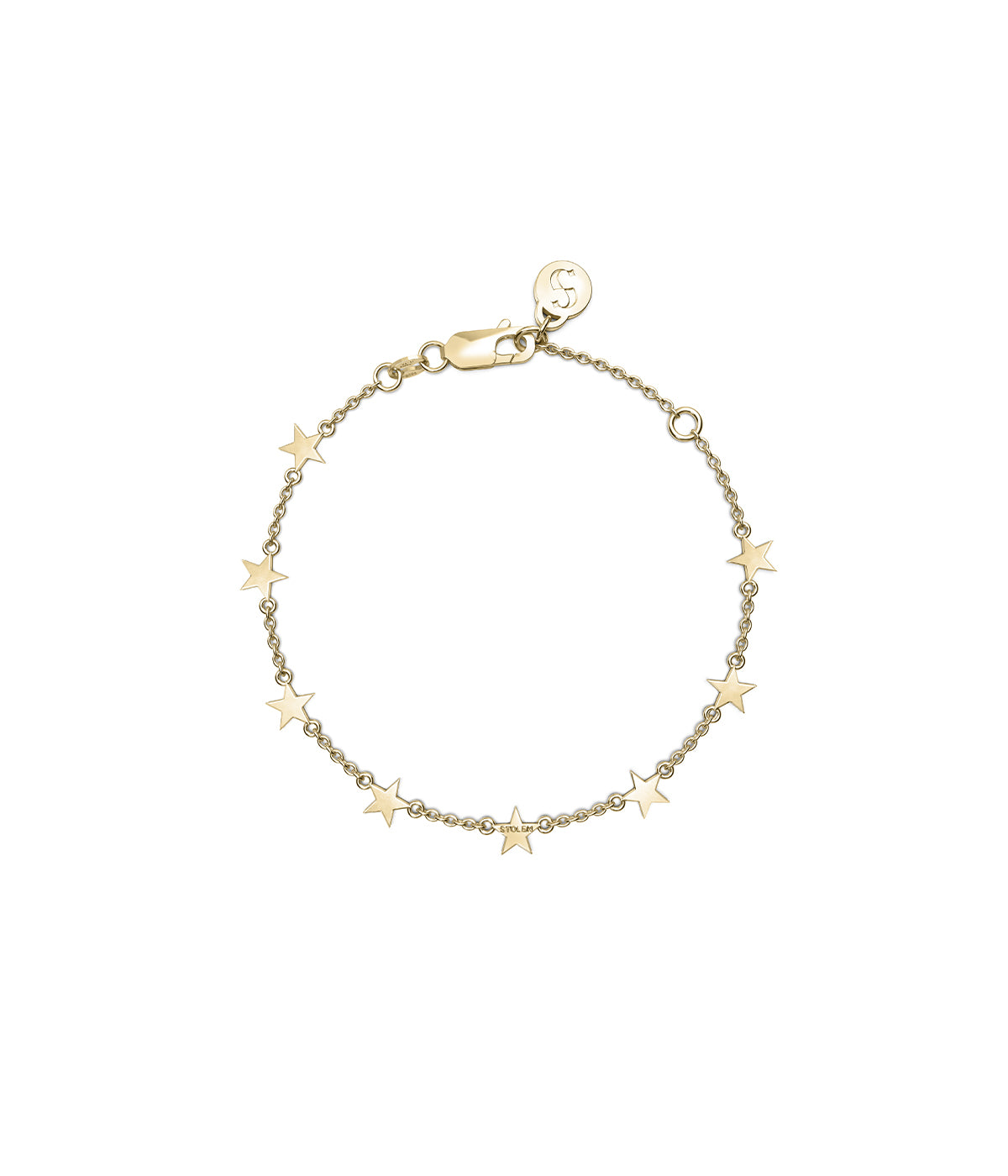 The Stolen Star Bracelet features 8 mini star charms fixed on a fine, sculpted 17cm chain with 3cm extension. This delicate charm-style bracelet is made from a solid sterling silver base and coated in 1.5 microns of lustrous 18k yellow gold.